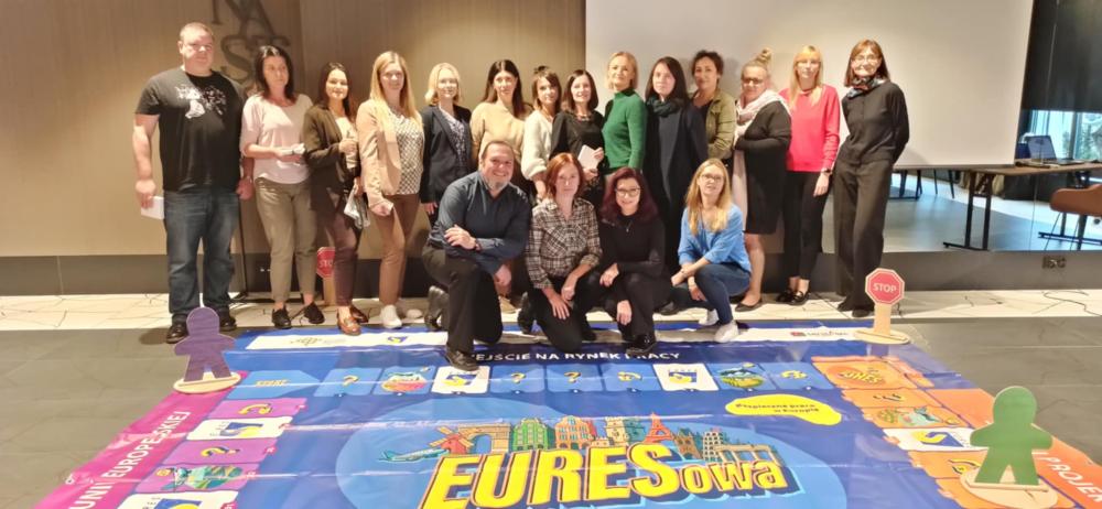 Podczas zorganizowanego przez Wojewódzki Urząd Pracy w Białymstoku szkolenia pt. „EURESowa gra planszowa - współpraca między regionami”, które odbyło się 9 października 2025 r., pracownicy powiatowych urzędów pracy realizujący zadania EURES mieli okazję zapoznać się ze stworzoną przez Wojewódzki Urząd Pracy we Wrocławiu grą planszową. Początkowo uczestnicy szkolenia wysłuchali historii powstania planszówki i zaznajomili się z jej zasadami. Następnie, podzieleni na cztery zespoły, przystąpili do rozgrywki. Zmagania na wielkoformatowej planszy euresowej gry nie tylko testowały wiedzę i kreatywność, wymagały również od graczy pracy zespołowej. Pracownicy urzędów pracy wysłuchali również relacji z wizyty studyjnej European Labour Authority w zakładach przetwórstwa łososi i krabów w Norwegii. Uczestnicy szkolenia dowiedzieli się nie tylko o kluczowych przedstawicielach branży przetwórstwa produktów morskich, ale również o procesach rekrutacyjnych do firm, a także ciekawych szczegółów związanych z samą specyfiką i warunkami pracy przy rybach i skorupiakach.